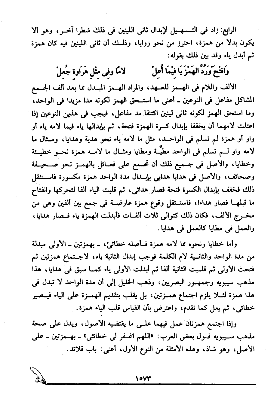 وإذا اجتمع همزتان عمل فيهما على ما يقتضيه الأصول، ويدل على صحة مذهب سيبويه قول بعض العرب: "اللهم اغفر لي خطائئي" -بهمزتين- على الأصل، وهو شاذ، وهذه الأمثلة من النوع الأول، أعني: باب قلائد.