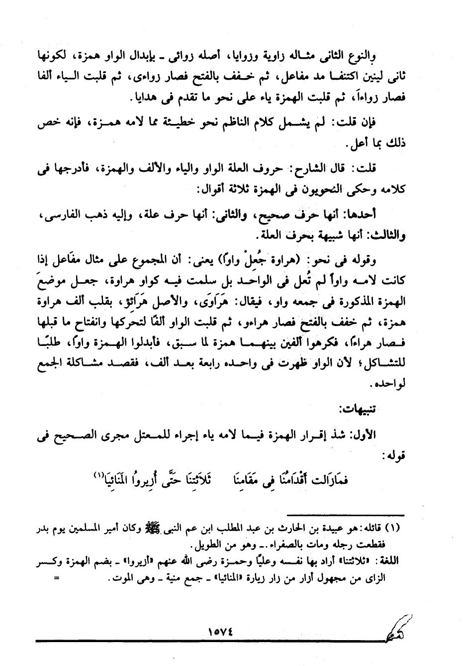 والنوع الثاني مثاله زاوية وزوايا، أصله زوائي، بإبدال الواو همزة؛ لكونها ثاني لينين اكتنفا مد مفاعل، ثم خفف بالفتح فصار زواءي، ثم قلبت الياء ألفا فصار زواءا، ثم قلبت الهمزة ياء على نحو ما تقدم في هدايا.