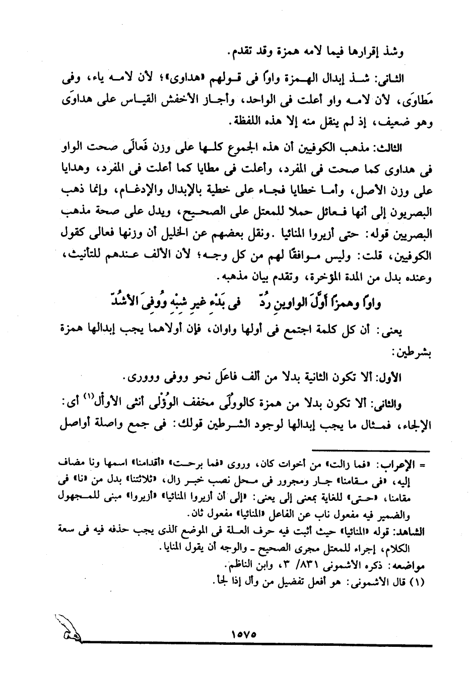 الثاني: شذ إبدال الهمزة واوا في قولهم: "هداوَى"؛ لأن لامه ياء، وفي مطاوَى؛ لأن لامه واو أعلت في الواحد، وأجاز الأخفش القياس على هداوَى، وهو ضعيف؛ إذ لم ينقل منه إلا هذه اللفظة.