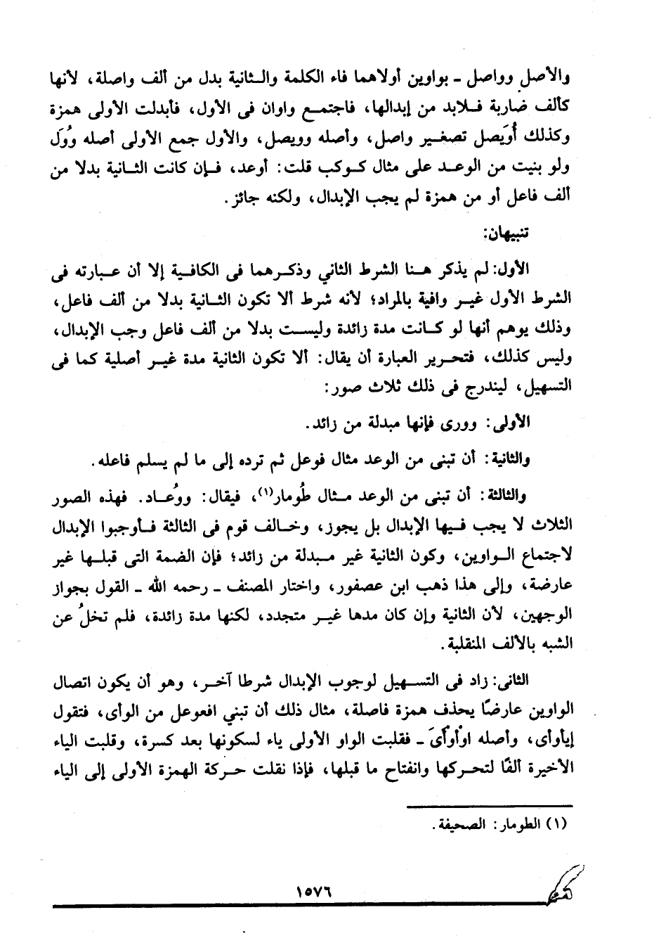 الثانية: زاد في التسهيل لوجوب الإبدال شرطا آخر، وهو أن يكون اتصال الواوين عارضا يحذف همزة فاصلة، مثال ذلك أن تبني افعوعل من الوأي، فتقول: إيأوأي، وأصله: اوْأوْأيَ، فقلبت الواو الأولى ياء لسكونها بعد كسرة، وقلبت الياء الآخرة ألفا لتحركها وانفتاح ما قبلها، فإذا نقلت حركة الهمزة الأولى إلى الياء