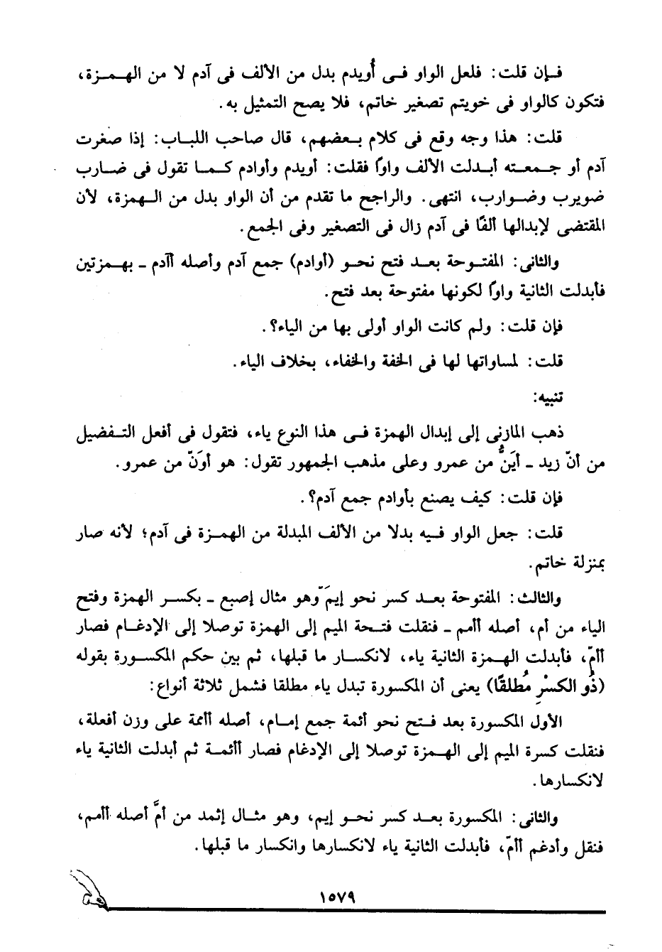 والثالث: المفتوحة بعد كسر نحو إيَمّ وهو مثال إصبع -بكسر الهمزة وفتح الياء- من أم، أصله أأمم، فنقلت فتحة الميم إلى الهمزة توصلا إلى الإدغام فصار أأم، فأبدلت الهمزة الثانية ياء؛ لانكسار ما قبلها، ثم بين حكم المكسورة بقوله: "ذو الكسر مطلقا" يعني: أن المكسورة تبدل ياء مطلقا، فشمل ثلاثة أنواع: