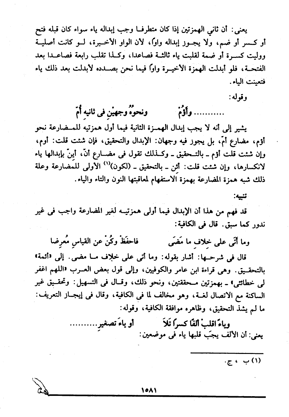 يشير إلى أنه لا يجب إبدال الهمزة الثانية فيما أول همزتيه للمضارعة نحو أؤم، مضارع أم، بل يجوز فيه وجهان: الإبدال والتحقيق، فإن شئت قلت: أوم، وإن شئت قلت أؤم -بالتحقيق- وكذلك تقول في مضارع أنّ: أيِنّ بإبدالها ياء لانكسارها، وإن شئت قلت: أئِن -بالتحقيق- "لكون"1 الأولى للمضارعة وعلة ذلك شبه همزة المضارعة بهمزة الاستفهام لمعاقبتها النون والتاء والياء.