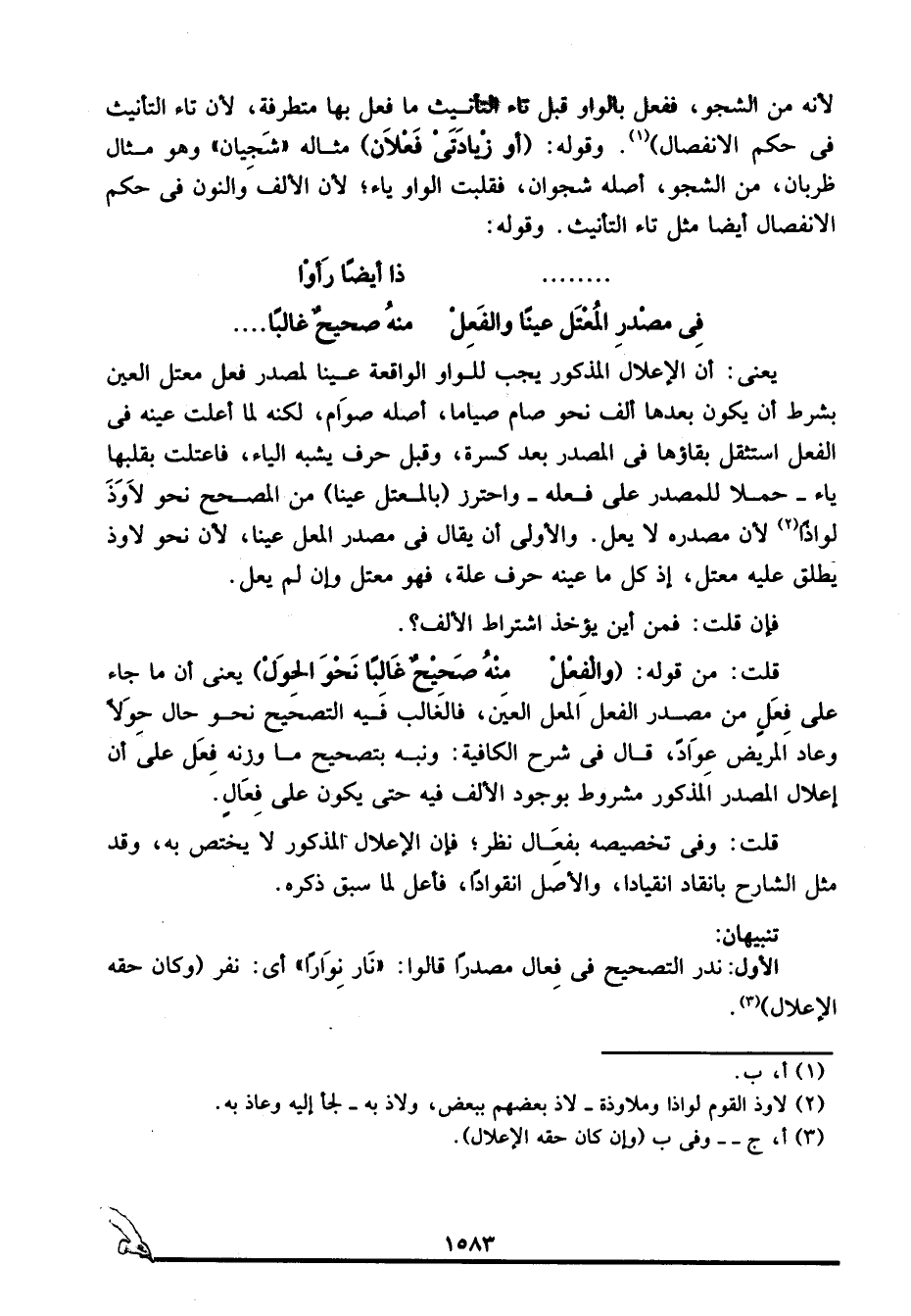 يعني: أن الإعلال المذكور يجب للواو الواقعة عينا لمصدر فعل معتل العين بشرط أن يكون بعدها ألف نحو صام صياما، أصله صوَام، لكنه لما أعلت عينه في الفعل استثقل بقاؤها في المصدر بعد كسرة، وقبل حرف يشبه الياء، فاعتل بقلبها ياء -حملا للمصدر على فعله- واحترز "بالمعتل عينا" من المصحح نحو لاوَذَ لواذا2؛ لأن مصدره لا يعل. والأولى أن يقال في مصدر المعل عينا؛ لأن نحو لاوذ يطلق عليه معتل؛ إذ كل ما عينه حرف علة، فهو معتل وإن لم يعل.