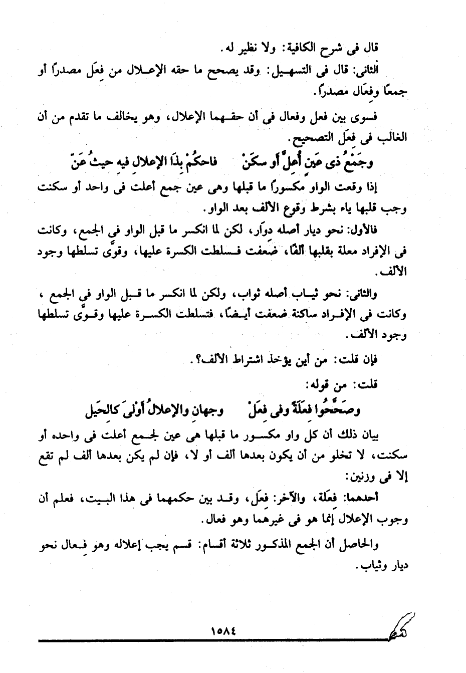 والحاصل أن الجمع المذكور ثلاثة أقسام: قسم يجب إعلاله وهو فِعَال نحو: ديار وثياب.