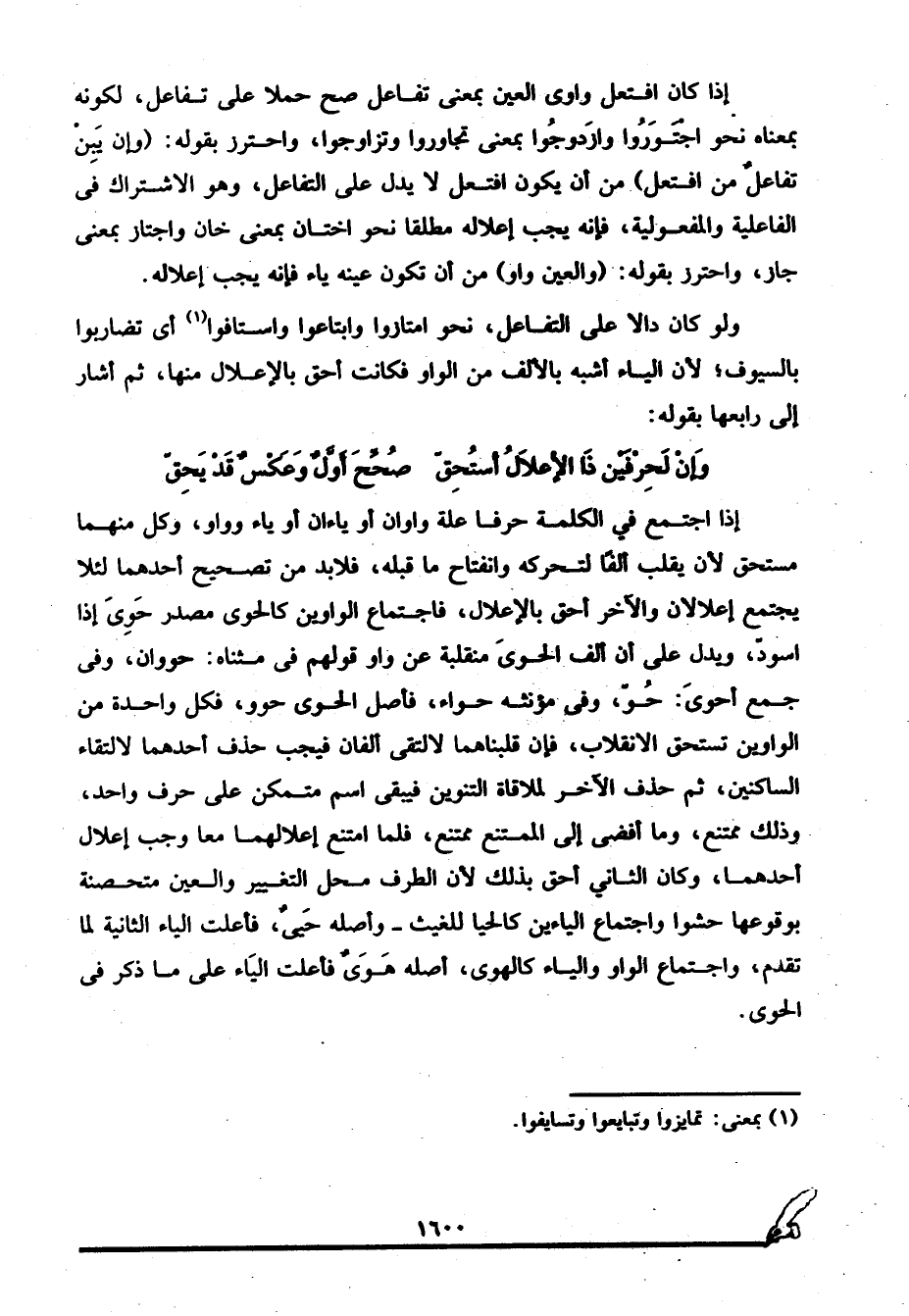 ولو كان دالا على التفاعل، نحو: امتازوا وابتاعوا واستافوا1 أي: تضاربوا بالسيوف؛ لأن الياء أشبه بالألف من الواو، فكانت أحق بالإعلال منها، ثم أشار إلى رابعها بقوله: