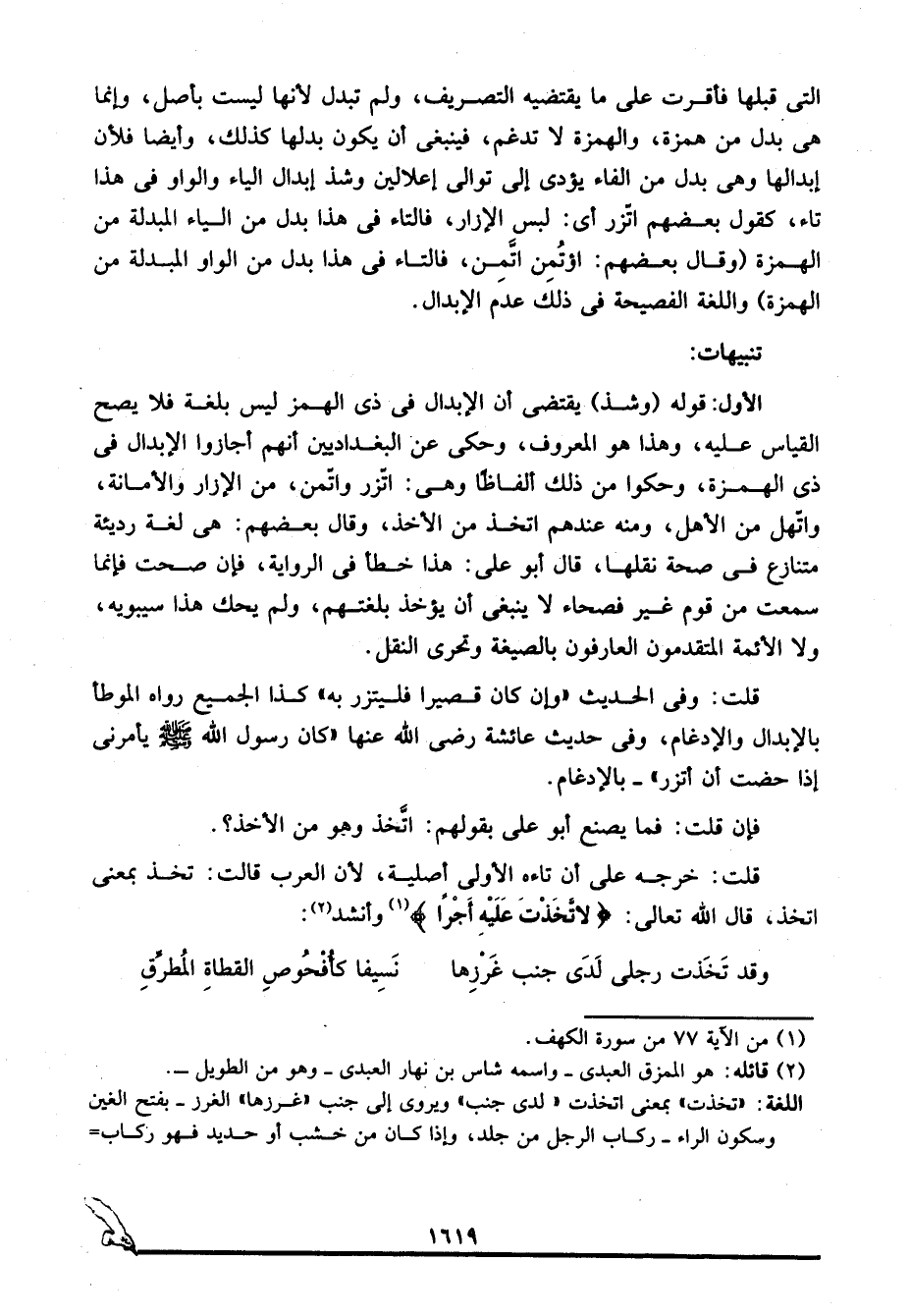 الأول: قوله "وشذ" يقتضي أن الإبدال في ذي الهمز ليس بلغة فلا يصح القياس عليه، وهذا هو المعروف، وحكى عن البغداديين أنهم أجازوا الإبدال في ذي الهمزة، وحكوا من ذلك ألفاظًا وهي: اتَّزر واتَّمن، من الإزار والأمانة، واتَّهل من الأهل، ومنه عندهم اتَّخذ من الأخذ، وقال بعضهم: هي لغة رديئة متنازع في صحة نقلها، قال أبو علي: هذا خطأ في الرواية، فإن صحت فإنما سمعت من قوم غير فصحاء لا ينبغي أن يؤخذ بلغتهم، ولم يحك هذا سيبويه، ولا الأئمة المتقدمون العارفون بالصيغة وتحري النقل.