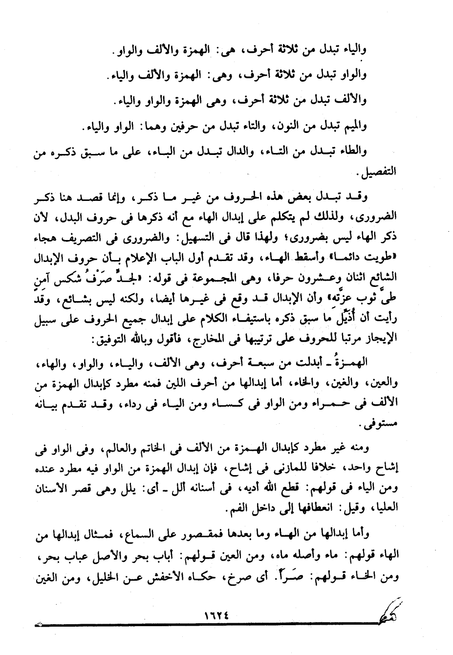 وأما إبدالها من الهاء وما بعدها فمقصور على السماع، فمثال إبدالها من الهاء قوله: ماء وأصله ماه، ومن العين قولهم: أباب بحر والأصل عباب بحر، ومن الخاء قولهم: صَرَأ. أي صرخ، حكاه الأخفش عن الخليل، ومن الغين