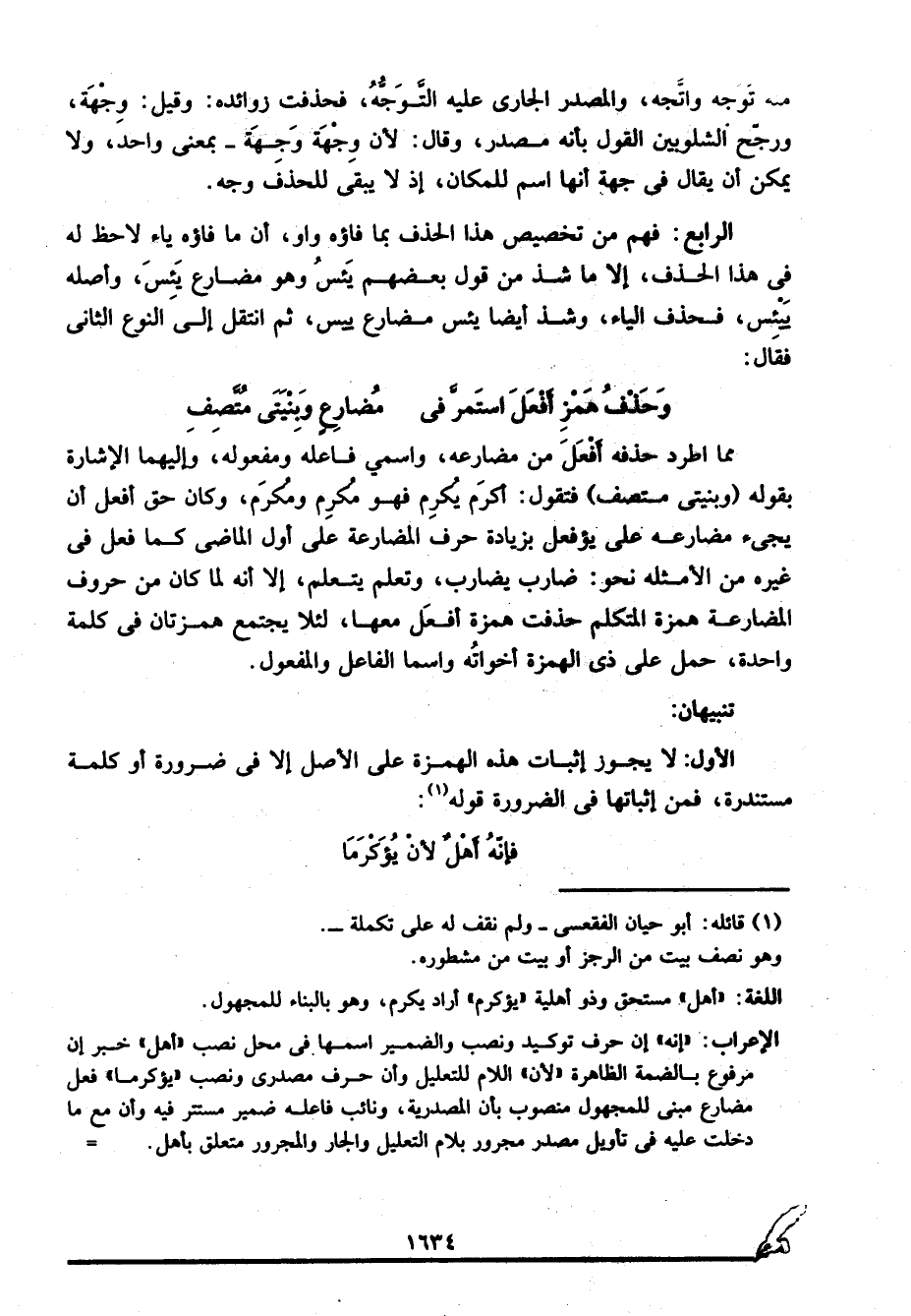 وَحَذْفُ هَمْزِ أَفْعَلَ استمرَّ فِي ... مُضارِعٍ وَبِنْيَتَي مُتَّصِفِ