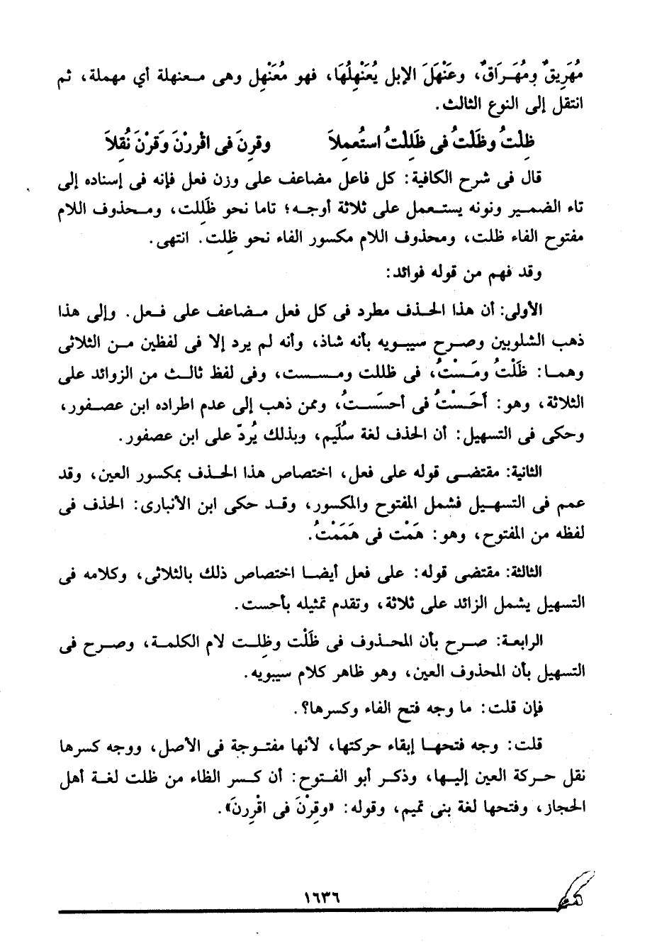 قال في شرح الكافية: كل فاعل مضاعف على وزن فعل فإنه في إسناده إلى تاء الضمير ونونه يستعمل على ثلاثة أوجه؛ تامًّا نحو ظللت، ومحذوف اللام مفتوح الفاء ظلت، ومحذوف اللام مكسورة الفاء نحو ظلت. انتهى.
