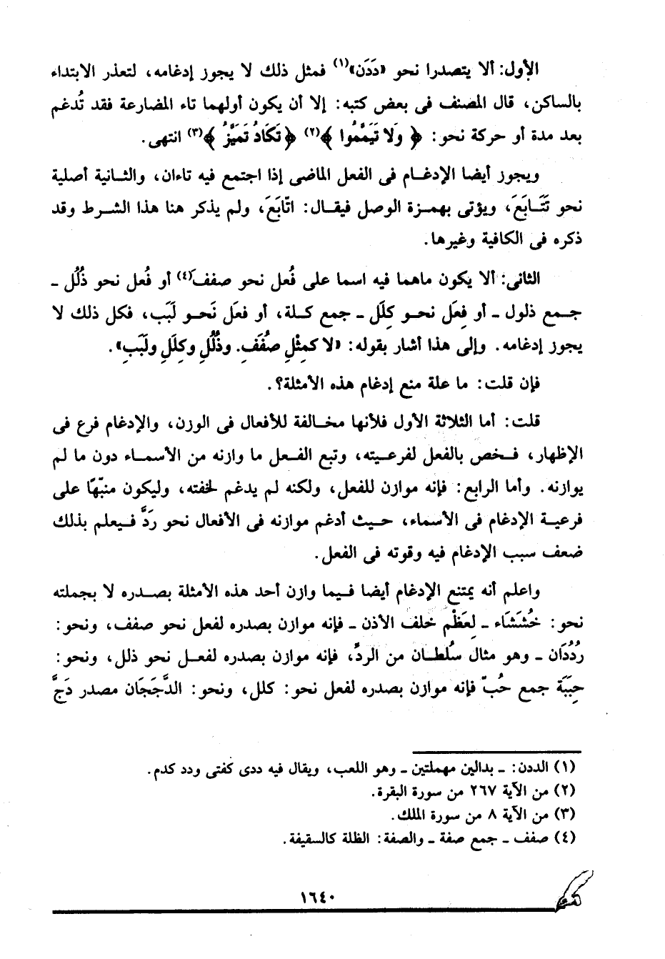الثاني: ألا يكون ماهما فيه اسما على فعل نحو صفف4 أو فعل نحو ذُلُل -جمع ذلول- أو فعل نحو كلل -جمع كلة، أو فعل نحو لبب، فكل ذلك لا يجوز إدغامه. وإلى هذا أشار بقوله: "لا كَمِثْلِ صُفف. وذلل وكلل ولبب".