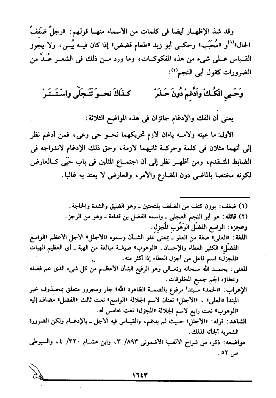 وقد شذ الإظهار أيضًا في كلمات من الأسماء منها قولهم: "رجلٌ ضَفِفُ الحال"1 و"مُحَبَب" وحكى أبو زيد "طعام قضض" إذا كان فيه يُبس، ولا يجوز القياس على شيء من هذه المفكوكات، وما ورد من ذلك في الشعر عد من الضرورات كقول أبي النجم2: