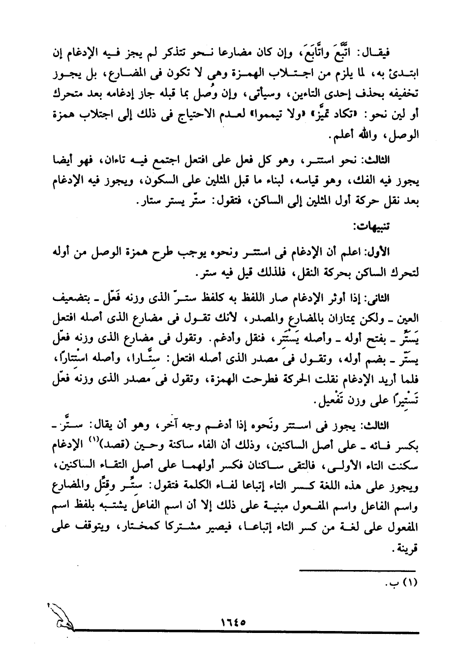الثاني: إذا أوثر الإدغام صار اللفظ به كلفظ ستر الذي وزنه فعل -بتضعيف العين- ولكن يمتازان بالمضارع والمصدر؛ لأنك تقول في مضارع الذي أصله افتعل يستر -بفتح أوله- وأصله يستتر، فنقل وأدغم. وتقول في مضارع الذي وزنه فعّل يسَتّر -بضم أوله، وتقول في مصدر الذي أصله افتعل: ستارًا، وأصله استتارًا، فلما أريد الإدغام نقلت الحركة فطرحت الهمزة، وتقول في مصدر الذي وزنه فعل تستيرًا على وزن تفعيل.