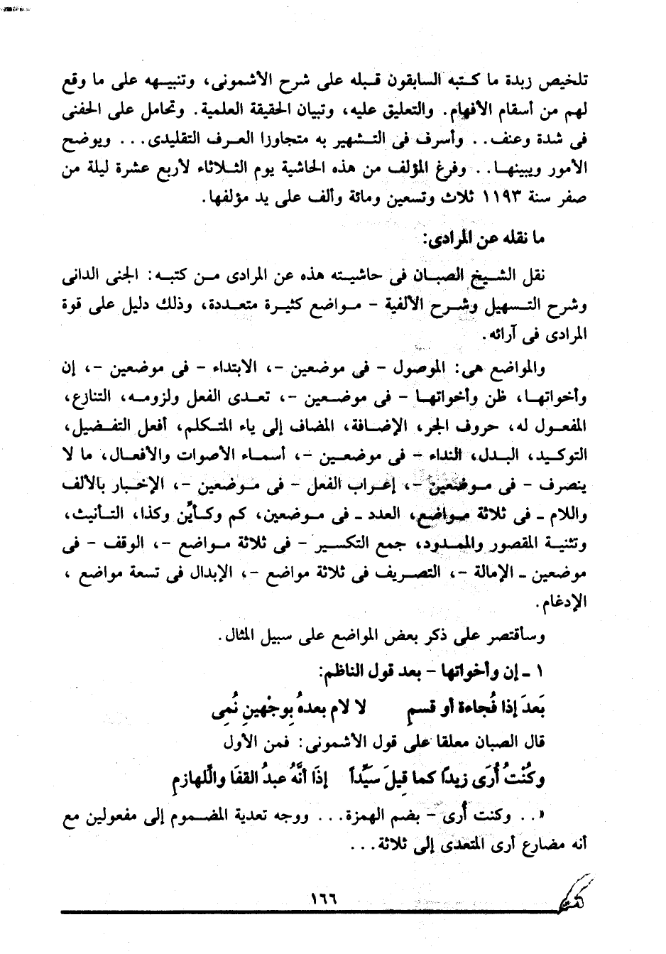 نقل الشيخ الصبان في حاشيته هذه عن المرادي من كتبه: الجنى الداني وشرح التسهيل وشرح الألفية, مواضع كثيرة متعددة، وذلك دليل على قوة المرادي في آرائه.