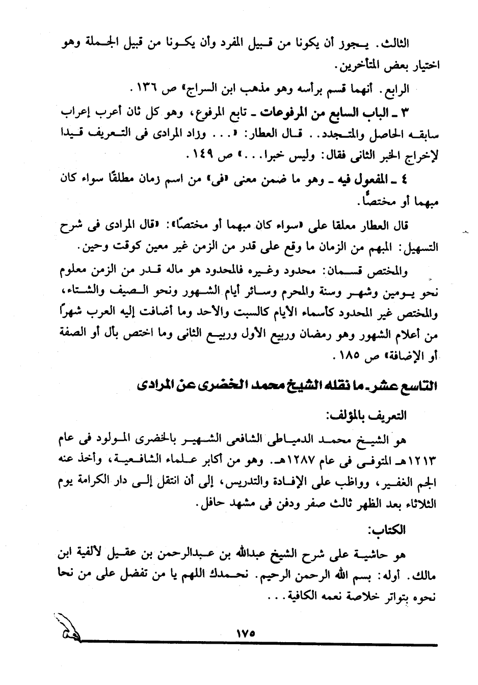 التاسع عشر: ما نقله الشيخ محمد الخضري عن المرادي:
