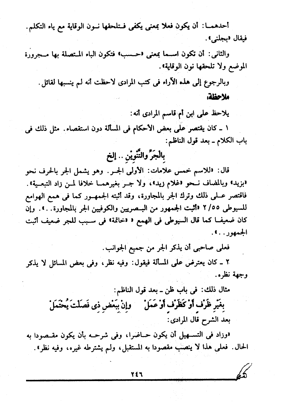قال: "للاسم خمس علامات: الأولى الجر, وهو يشمل الجر بالحرف نحو "بزيد" وبالمضاف نحو "غلام زيد", ولا جر بغيرهما خلافا لمن زاد التبعية". فاقتصر على ذلك وترك الجر بالمجاورة، وقد أثبته الجمهور كما في همع الهوامع للسيوطي 55/ 2 "أثبت الجمهور من البصريين والكوفيين الجر بالمجاورة ... ". وإن كان ضعيفا كما قال السيوطي في الهمع "خاتمة" في سبب للجر ضعيف أثبت الجمهور..".
