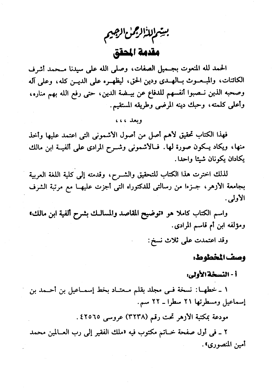 فهذا الكتاب تحقيق لأهم أصل من أصول الأشموني التي اعتمد عليها وأخذ منها، ويكاد يكون صورة لها, فالأشموني وشرح المرادي على ألفية ابن مالك يكادان يكونان شيئا واحدا.