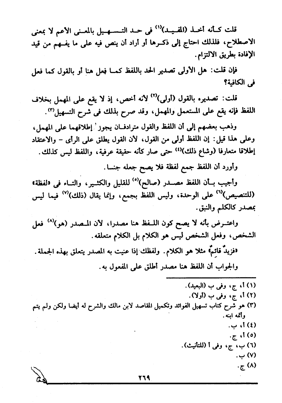 قلت كأنه أخذ "المفيد"1 في حد التسهيل بالمعنى الأعم لا بمعنى الاصطلاح، فلذلك احتاج إلى ذكرها أو أراد أن ينص فيه على ما يفهم من قيد الإفادة بطريق الالتزام.