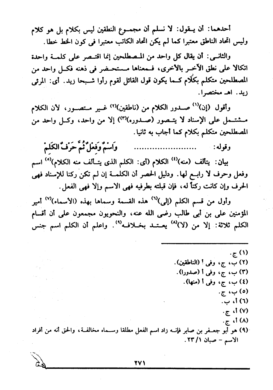 بيان: يتألف "منه"4 الكلام "أي: الكلم الذي يتألف منه الكلام"5 اسم وفعل وحرف لا رابع لها. ودليل الحصر أن الكلمة إن لم تكن ركنا للإسناد فهي الحرف وإن كانت ركنا له، فإن قبلته بطرفيه فهي الاسم وإلا فهي الفعل.