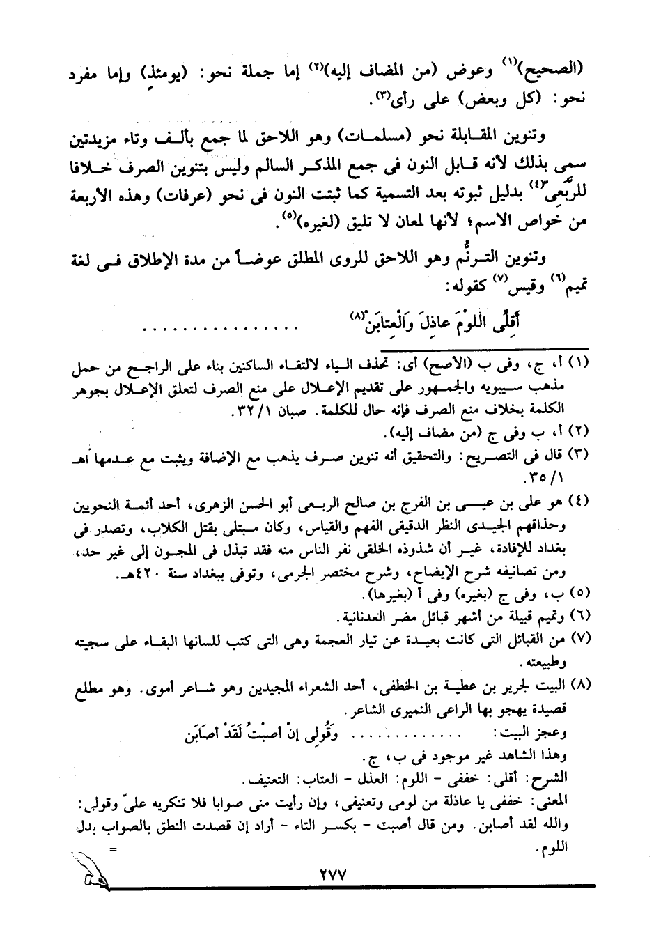 3 قال في التصريح: والتحقيق أنه تنوين صرف يذهب مع الإضافة ويثبت مع عدمها. ا. هـ. 1/ 35.