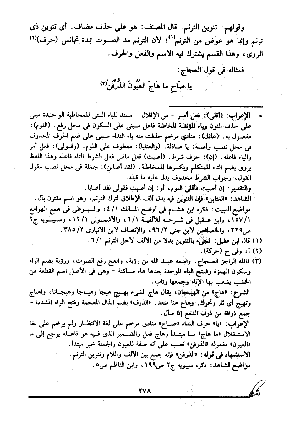 1 قال ابن عقيل: فجيء بالتنوين بدلا من الألف لأجل الترنم 1/ 6.