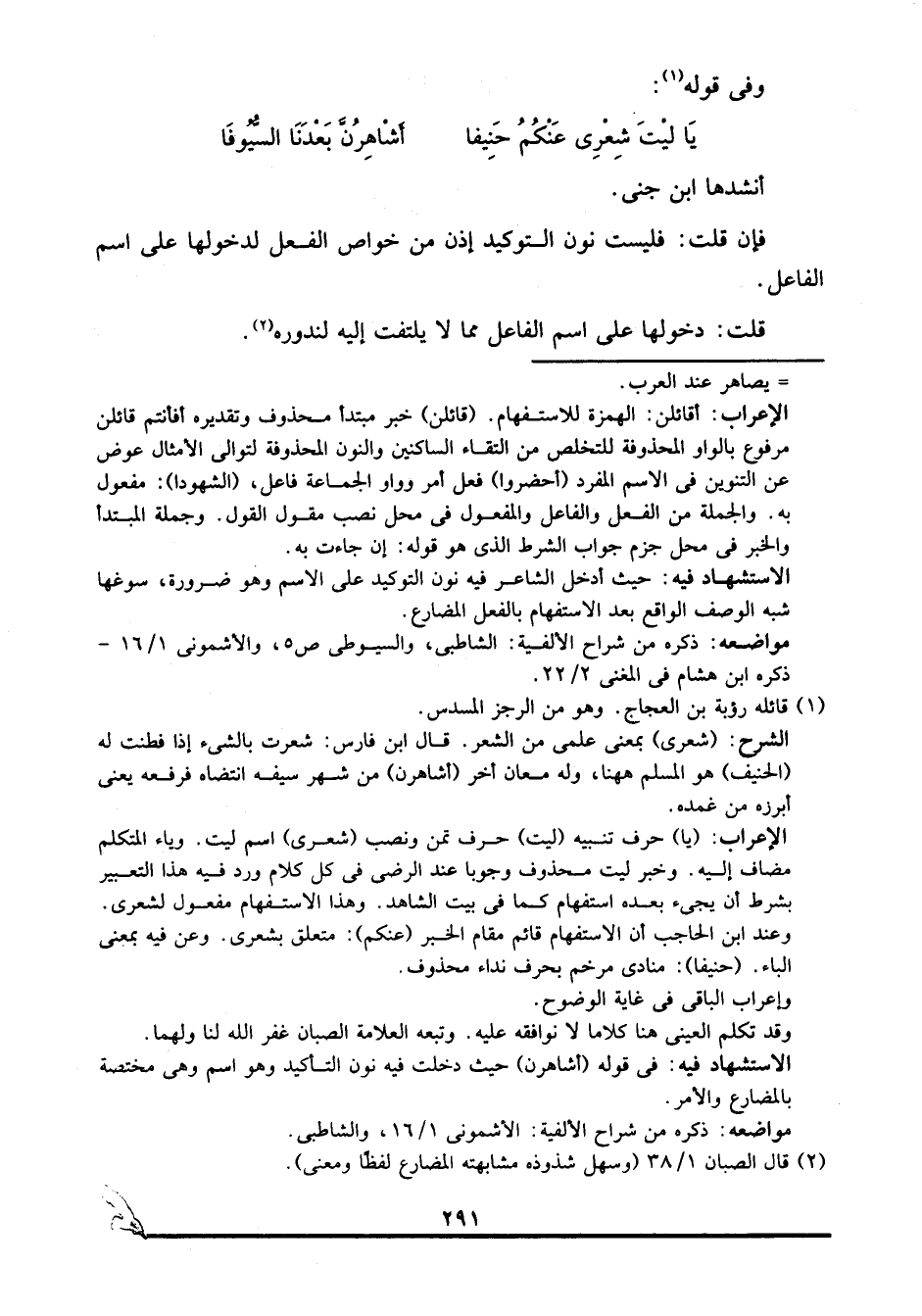 الإعراب: "يا" حرف تنبيه "ليت" حرف تمن ونصب "شعري" اسم ليت, وياء المتكلم مضاف إليه, وخبر ليت محذوف وجوبا عند الرضي في كل كلام ورد فيه هذا التعبير بشرط أن يجيء بعده استفهام كما في بيت الشاهد, وهذا الاستفهام مفعول لشعري. وعند ابن الحاجب أن الاستفهام قائم مقام الخبر "عنكم": متعلق بشعري. وعن فيه بمعنى الباء. "حنيفا": منادى مرخم بحرف نداء محذوف.