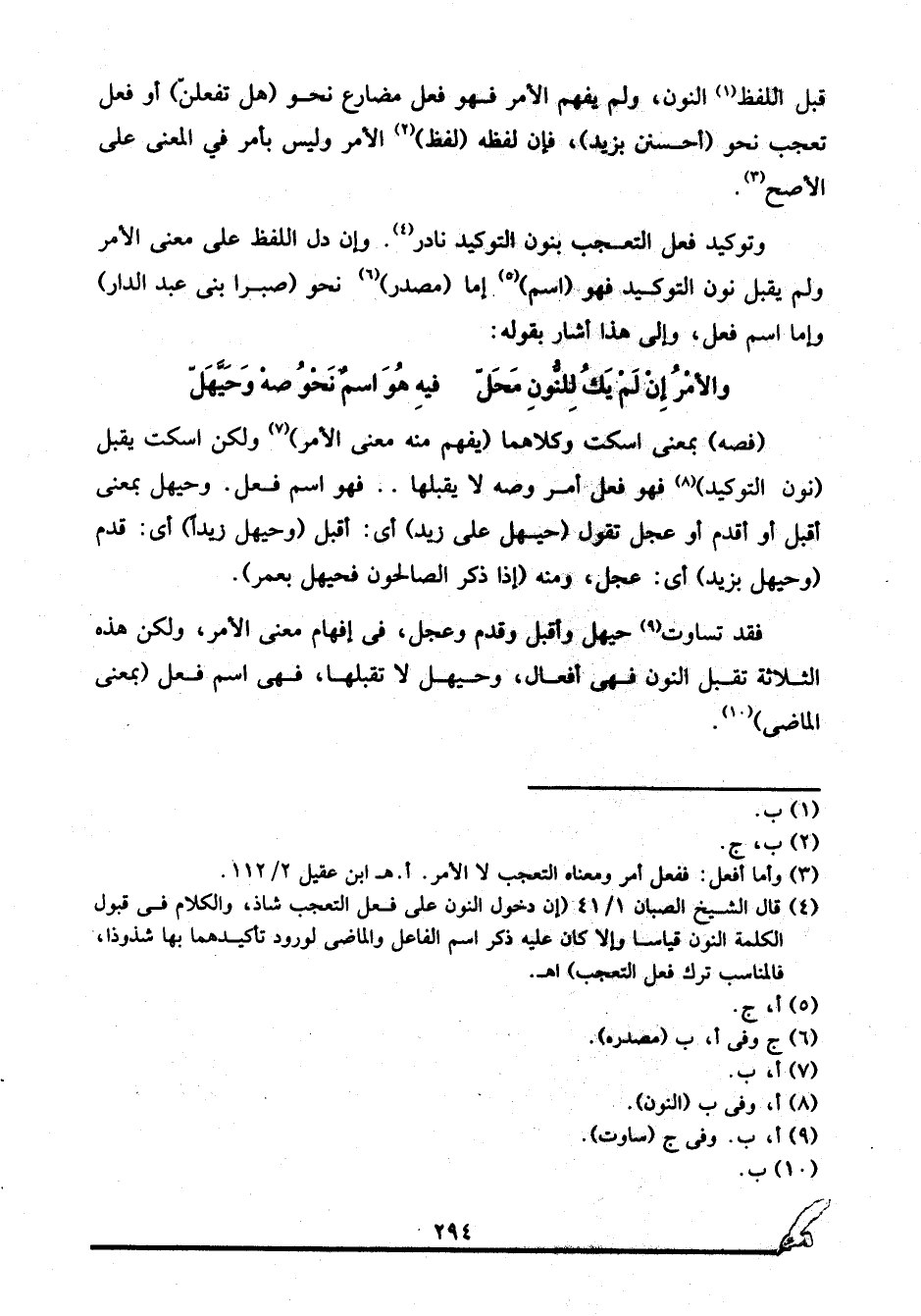 4 قال الشيخ الصبان 1/ 41 "إن دخول النون على فعل التعجب شاذ، والكلام في قبول الكلمة النون قياسا وإلا كان عليه ذكر اسم الفاعل والماضي لورود تأكيدهما بها شذوذا، فالمناسب ترك فعل التعجب". ا. هـ.