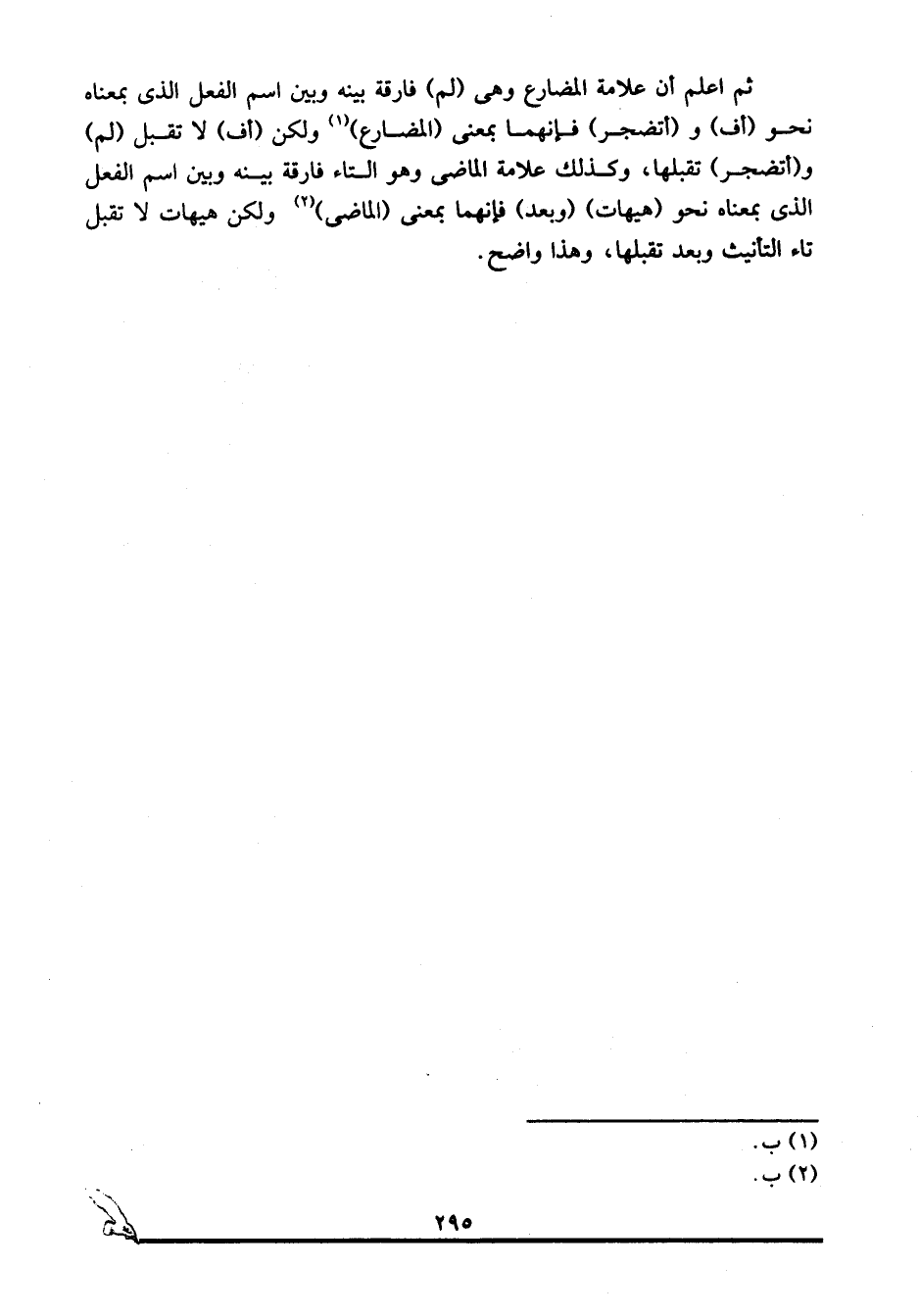 ثم اعلم أن علامة المضارع وهي "لم" فارقة بينه وبين اسم الفعل الذي بمعناه نحو "أف" و"أتضجر" فإنهما بمعنى "المضارع"1 ولكن "أف" لا تقبل "لم" و"أتضجر" تقبلها، وكذلك علامة الماضي وهو التاء فارقة بينه وبين اسم الفعل الذي بمعناه نحو "هيهات" "وبعد" فإنهما بمعنى "الماضي"2 ولكن هيهات لا تقبل تاء التأنيث وبعد تقبلها، وهذا واضح.
