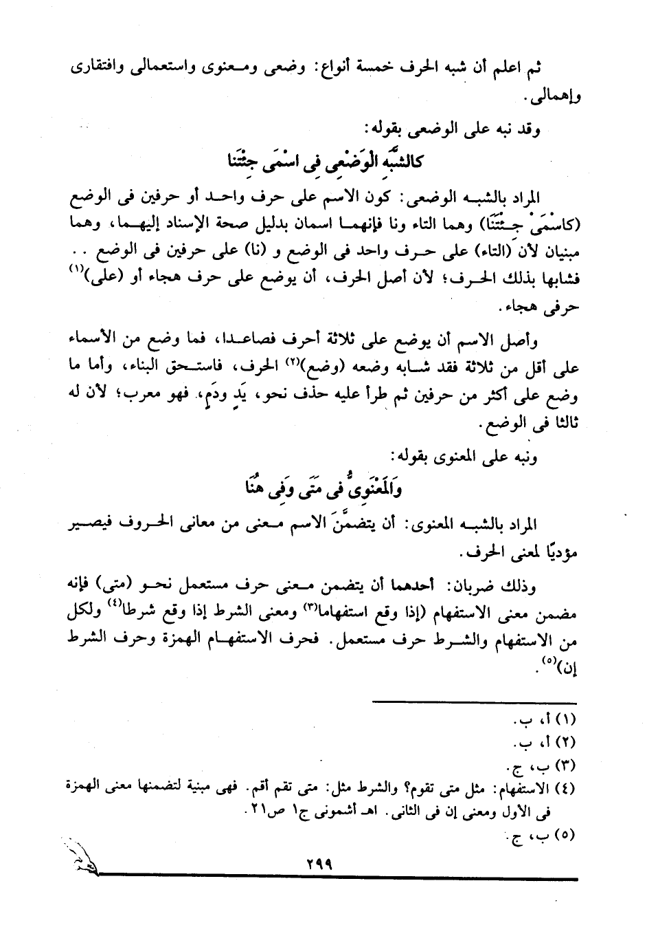 ثم اعلم أن شبه الحرف خمسة أنواع: وضعي ومعنوي واستعمالي وافتقاري وإهمالي.