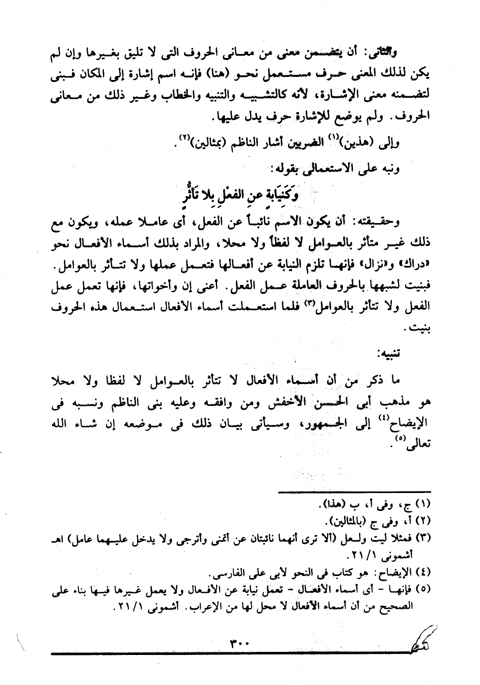 5 فإنها -أي أسماء الأفعال- تعمل نيابة عن الأفعال ولا يعمل غيرها فيها بناء على الصحيح من أن أسماء الأفعال لا محل لها من الإعراب. أشموني 1/ 21.
