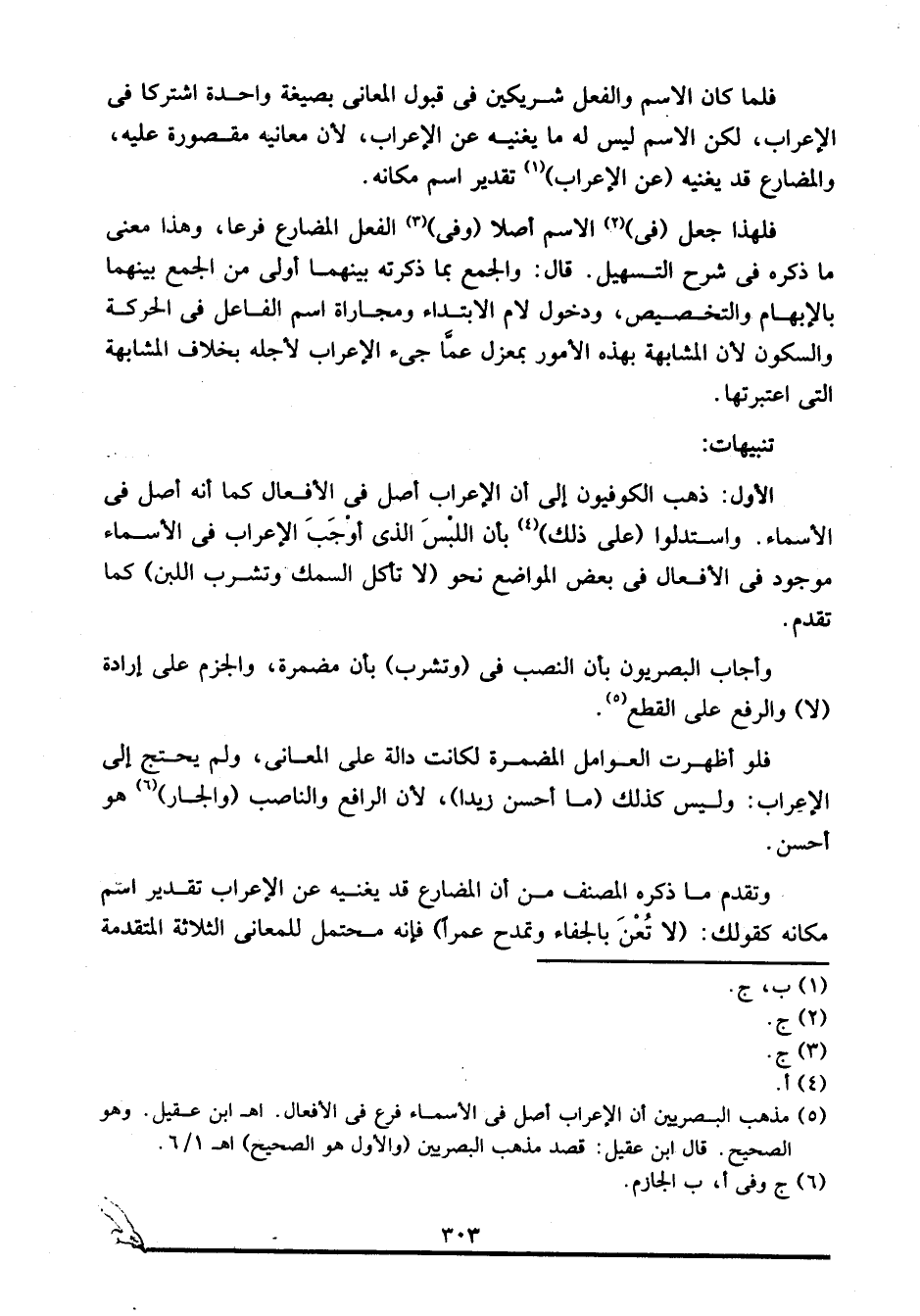 5 مذهب البصريين أن الإعراب أصل في الأسماء فرع في الأفعال. ا. هـ. ابن عقيل, وهو الصحيح. قال ابن عقيل: قصد مذهب البصريين "والأول هو الصحيح". ا. هـ. 1/ 6.