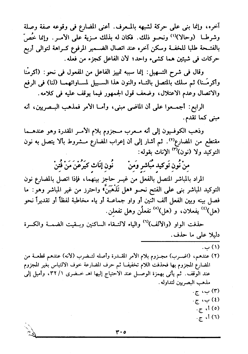 المراد بالمباشر المتصل بالفعل من غير حاجز بينهما، فإذ اتصل بالمضارع نون التوكيد المباشر بني على الفتح نحو "هل تذهبن" واحترز من غير المباشر وهو: ما فصل بينه وبين الفعل ألف اثنين أو واو جماعة أو ياء مخاطبة لفظا أو تقديرا نحو "هل"4 يفعلان، و"هل"5 تفعلُن وهل تفعلِن.