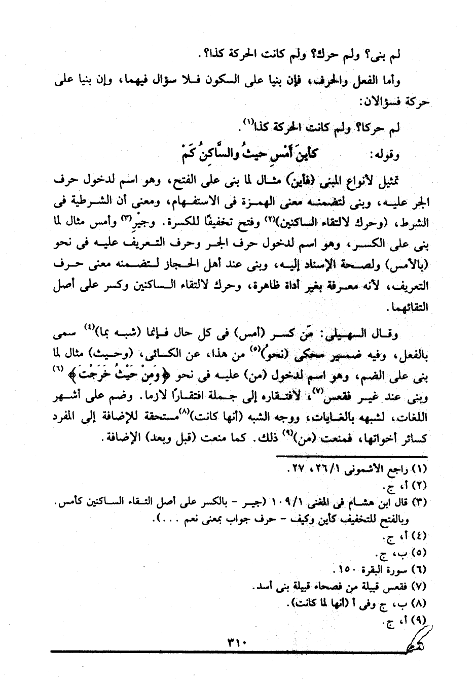 وقال السهيلي: من كسر "أمس" في كل حال فإنما "شبه بما"4 سمي بالفعل، وفيه ضمير محكي "نحو"5 من هذا، عن الكسائي "وحيث" مثال لما بني على الضم، وهو اسم لدخول "من" عليه في نحو: {وَمِنْ حَيْثُ خَرَجْتَ} 6 وبني عند غير فقعس7، لافتقاره إلى جملة افتقارا لازما, وضم على أشهر اللغات، لشبهه بالغايات، ووجه الشبه "أنها كانت"8 مستحقة للإضافة إلى المفرد كسائر أخواتها، فمنعت "من"9 ذلك. كما منعت "قبل وبعد" الإضافة.