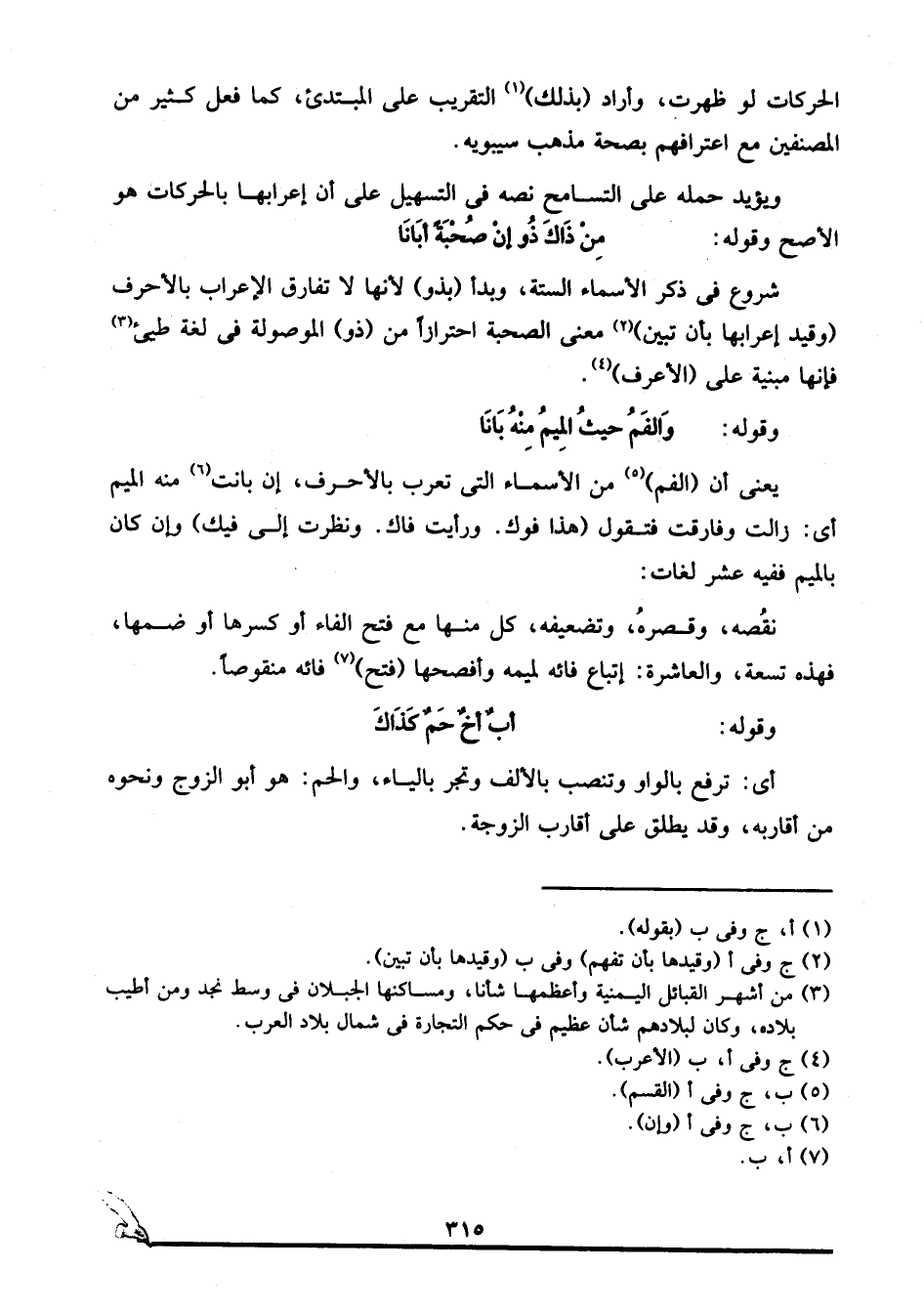 شرع في ذكر الأسماء الستة، وبدأ "بذو" لأنها لا تفارق الإعراب بالأحرف "وقيد إعرابها بأن تبين"2 معنى الصحبة احترازا من "ذو" الموصولة في لغة طيئ3 فإنها مبنية على "الأعرف"4.