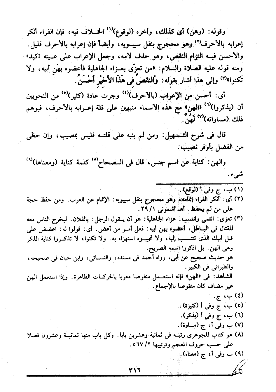 أي: أحسن من الإعراب "بالأحرف"4 وجرت عادة "كثير"5 من النحويين أن "يذكروا"6 "الهن" مع هذه الأسماء منبهين على قلة إعرابه بالأحرف، فيوهم ذلك "مساواته"7 لَهُنَّ.