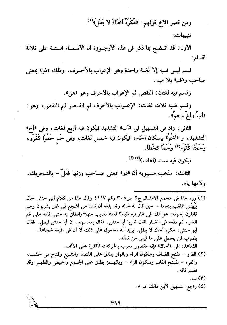 الأول: قد اتضح بما ذكر في هذه الأرجوزة أن الأسماء الستة على ثلاثة أقسام: