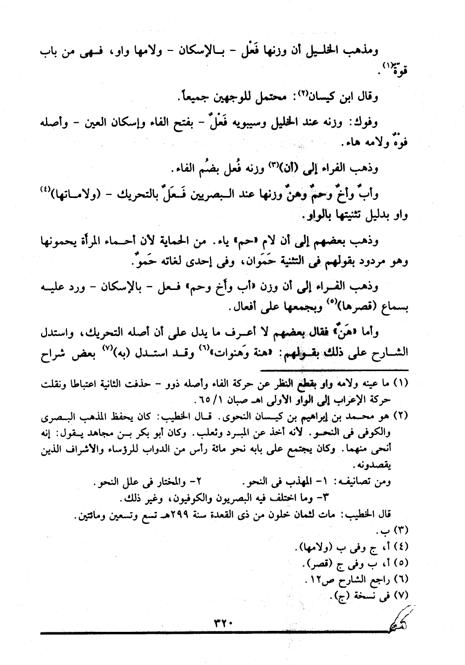 وأب وأخ وحم وهن وزنها عند البصريين فَعَل -بالتحريك- "ولاماتها"4 واو بدليل تثنيتها بالواو.