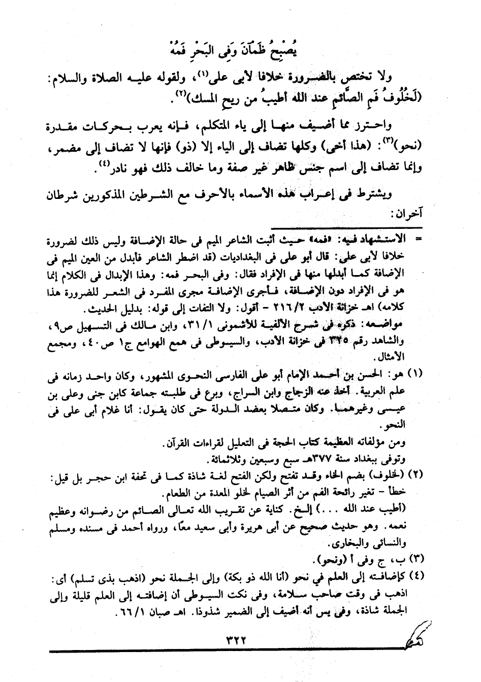 = الاستشهاد فيه: "فمه" حيث أثبت الشاعر الميم في حالة الإضافة وليس ذلك لضرورة خلافا لأبي عليّ: قال أبو عليّ في البغداديات: "قد اضطر الشاعر فأبدل من العين الميم في الإضافة كما أبدلها منها في الإفراد فقال: وفي البحر فمه. وهذا الإبدال في الكلام إنما هو في الإفراد دون الإضافة، فأجرى الإضافة مجرى المفرد في الشعر للضرورة هذا كلامه". ا. هـ. خزانة الأدب 2/ 216. أقول: ولا التفات إلى قوله: بدليل الحديث.