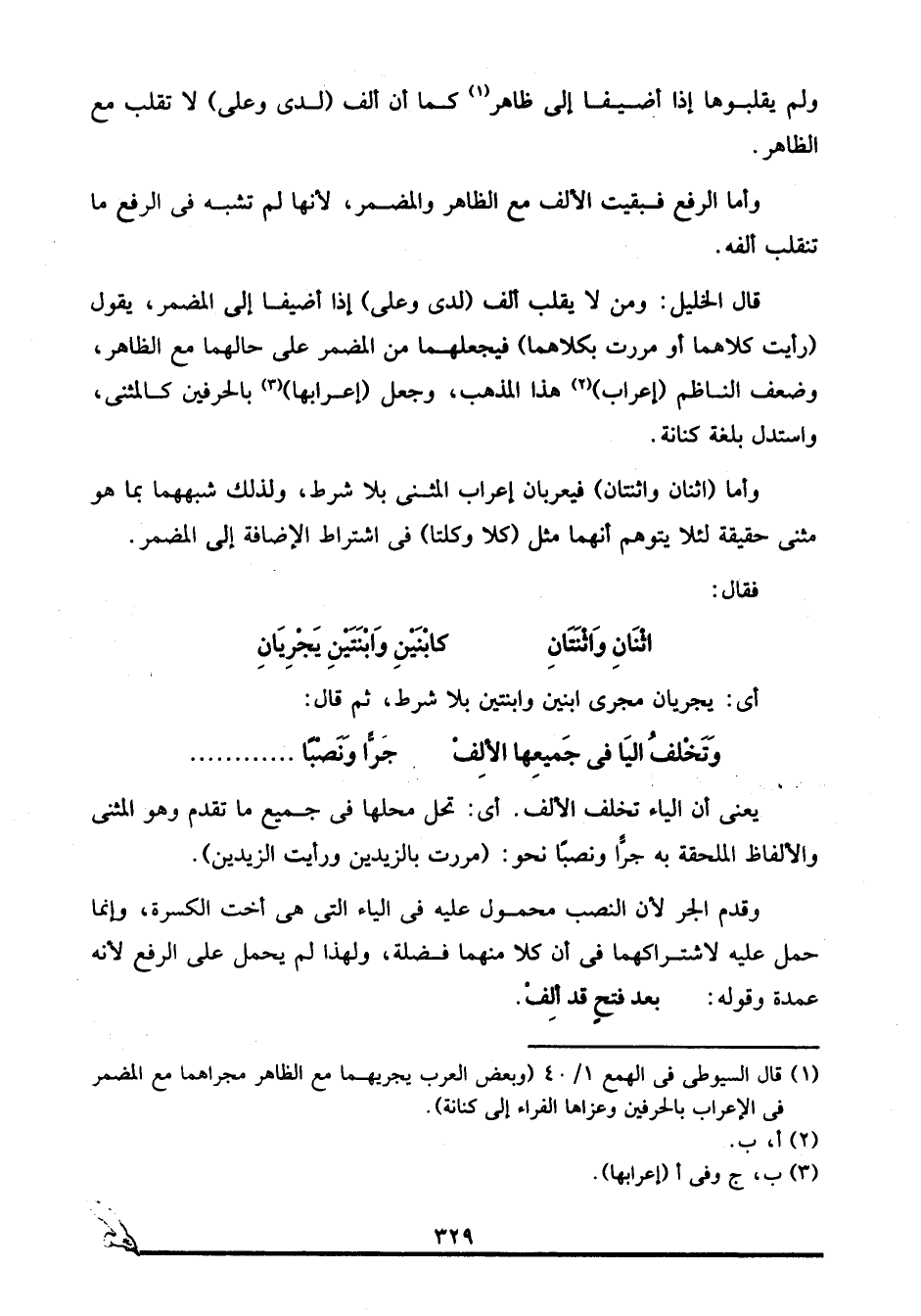 قال الخليل: ومن لا يقلب ألف "لدى وعلى" إذا أضيفا إلى المضمر، يقول: "رأيت كلاهما أو مررت بكلاهما" فيجعلهما من المضمر على حالهما مع الظاهر، وضعف الناظم "إعراب"2 هذا المذهب، وجعل "إعرابها"3 بالحرفين كالمثنى، واستدل بلغة كنانة.