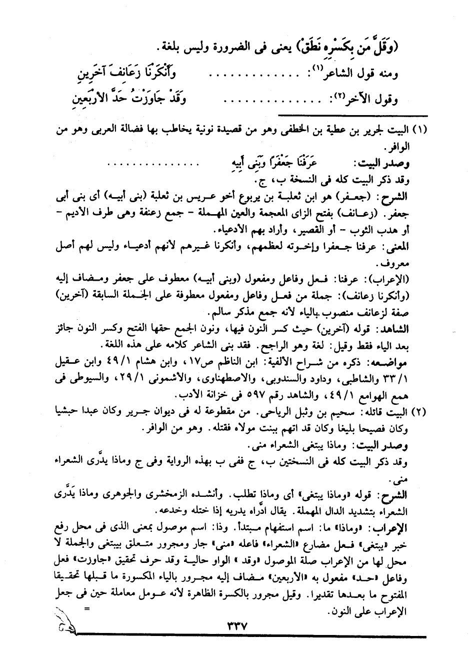 مواضعه: ذكره من شراح الألفية: ابن الناظم ص17، وابن هشام 1/ 49، وابن عقيل 1/ 33 والشاطبي، وداود, والسندوبي، والاصطهناوي، والأشموني 1/ 29، والسيوطي في همع الهوامع 1/ 49، والشاهد رقم 597 في خزانة الأدب.