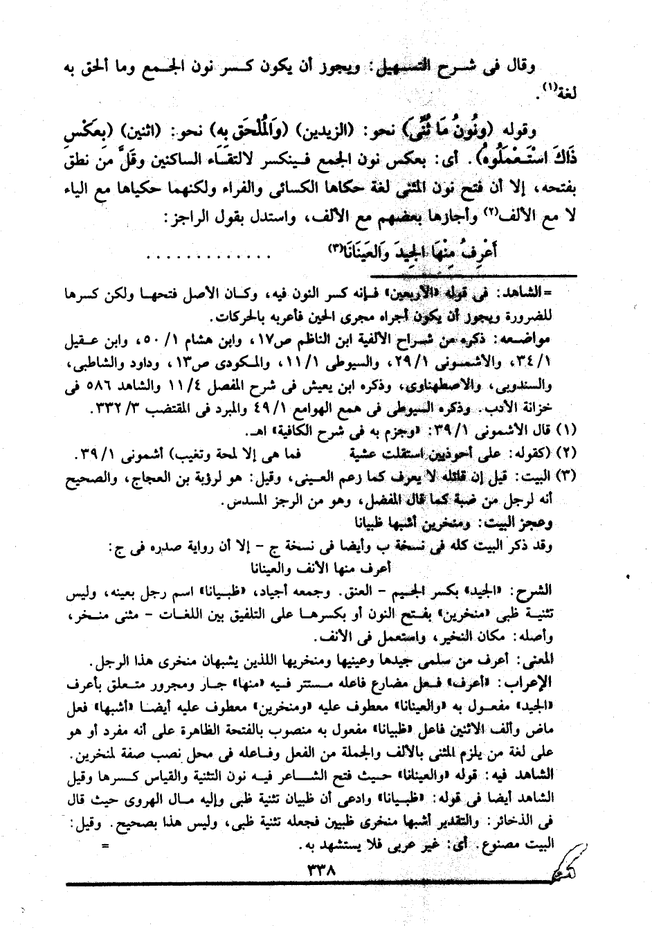 وقوله "ونون ما ثني" نحو: "الزيدين" "والملحق به" نحو: "اثنين" "بعكس ذاك استعملوه". أي: بعكس نون الجمع فينكسر لالتقاء الساكنين وقل من نطق بفتحه، إلا أن فتح نون المثنى لغة حكاها الكسائي والفراء ولكنهما حكياها مع الياء لا مع الألف2 وأجازها بعضهم مع الألف، واستدل بقول الراجز: