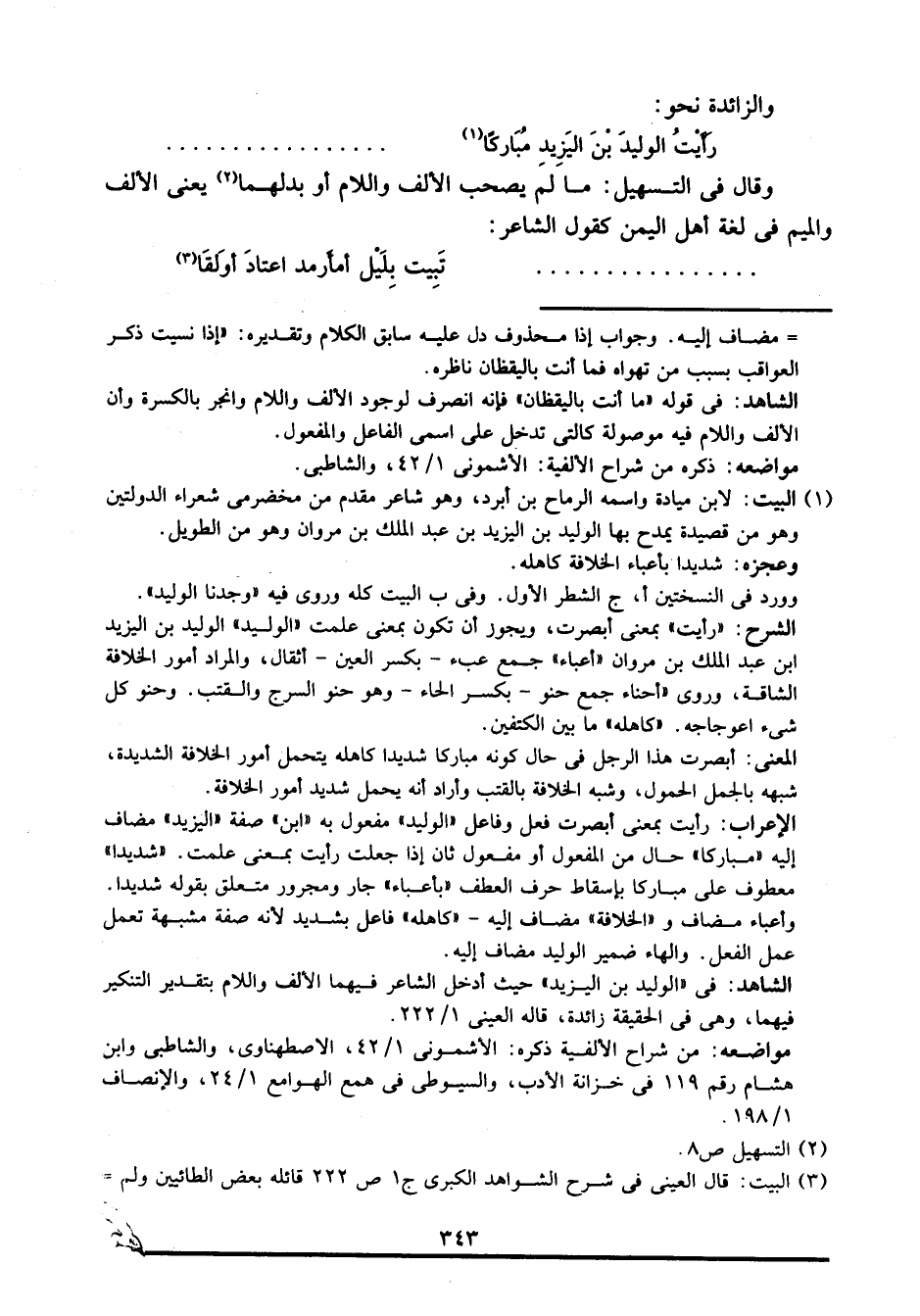 الشاهد: في "الوليد بن اليزيد" حيث أدخل الشاعر فيهما الألف واللام بتقدير التنكير فيهما، وهي في الحقيقة زائدة، قاله العيني 1/ 222.