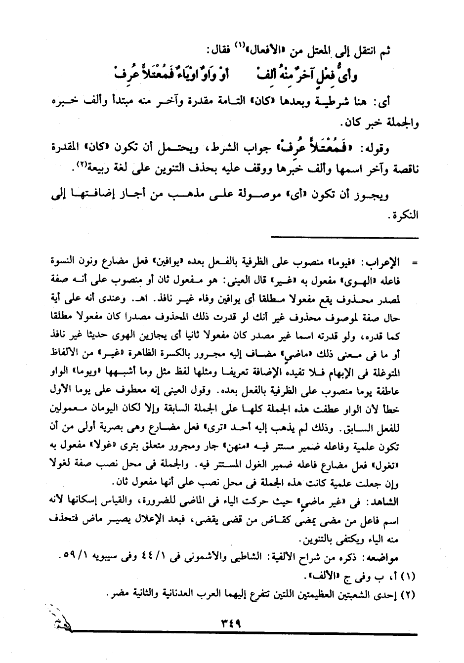 الشاهد: في "غير ماضيٍ" حيث حركت الياء في الماضي للضرورة، والقياس إسكانها لأنه اسم فاعل من مضى يمضي كقاض من قضى يقضي، فبعد الإعلال يصير ماض فتحذف منه الياء ويكتفي بالتنوين.