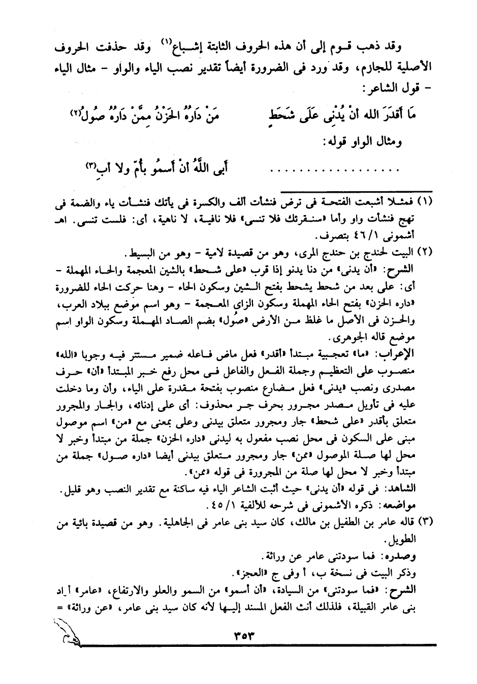 وقد ذهب قوم إلى أن هذه الحروف الثابتة إشباع1 وقد حذفت الحروف الأصلية للجازم، وقد ورد في الضرورة أيضا تقدير نصب الياء والواو -مثال الياء- قول الشاعر: