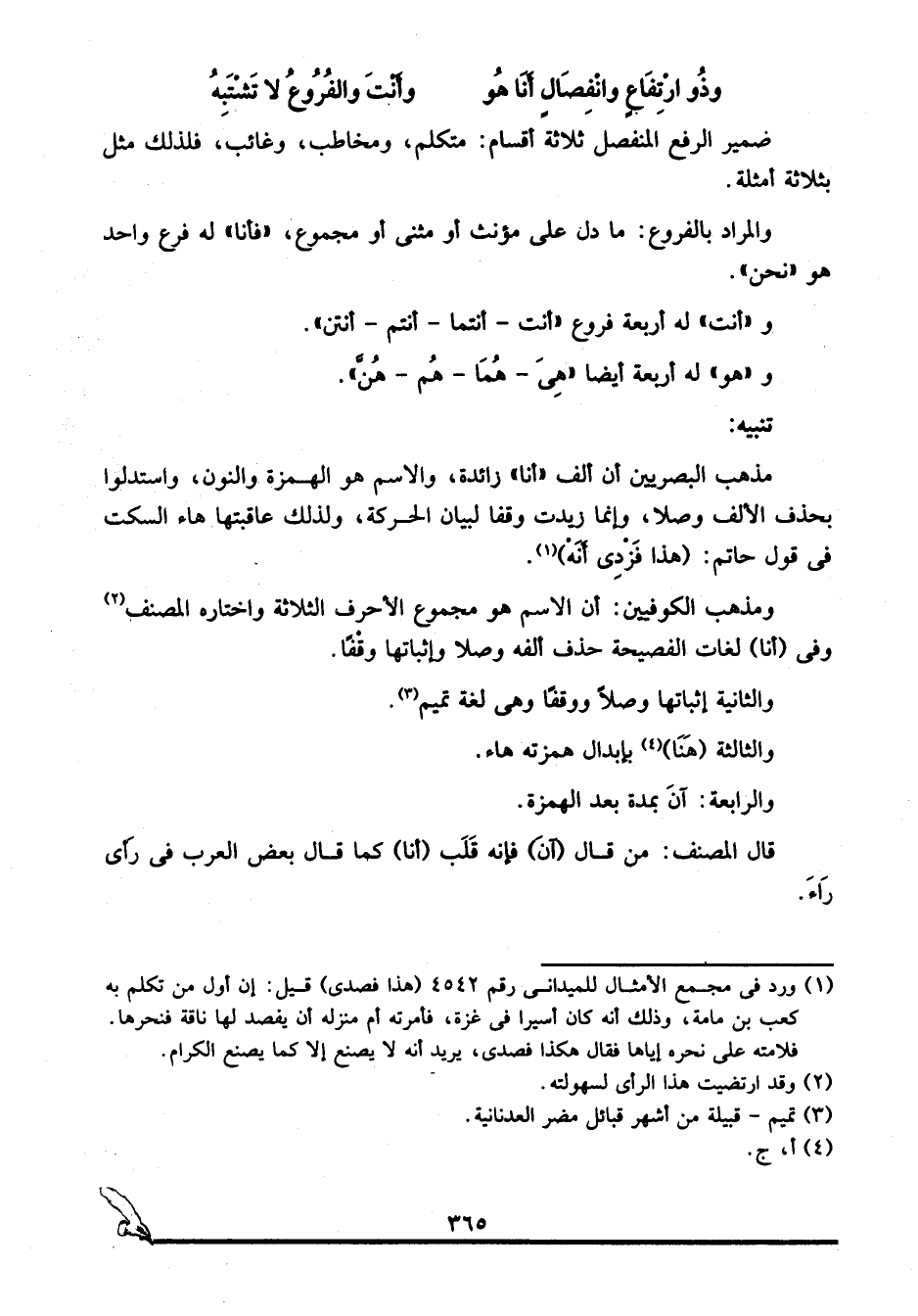 ومذهب الكوفيين: أن الاسم هو مجموع الأحرف الثلاثة واختاره المصنف2 وفي "أنا" لغات الفصيحة حذف ألفه وصلا وإثباتها وقفا.