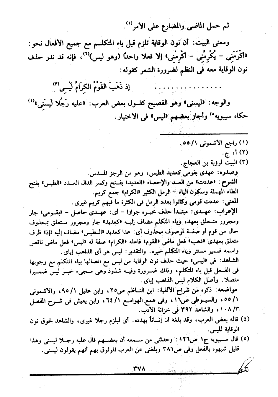 ومعنى البيت: أن نون الوقاية تلزم قبل ياء المتكلم مع جميع الأفعال نحو: "أكرَمني, يكرمني, أكرِمني" إلا فعلا واحدا "وهو ليس"2، فإنه قد ندر حذف نون الوقاية معه في النظم لضرورة الشعر كقوله: