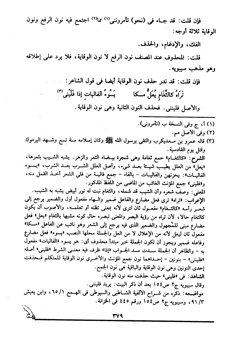 الإعراب: "تراه" ترى فعل مضارع وفاعل ضمير والهاء مفعول أول والضمير يرجع إلى شعر رأسه "كالثغام" مفعول ثان لترى لأنه بمعنى تظنه أو تعلمه، والأصوب أن يكون كالثغام حالا، لأن تراه من رؤية البصر والمعنى تبصره حال كونه مشبها بالثغام "يعل" فعل مضارع مبني للمجهول والضمير الذي فيه يرجع إلى الشعر وهو نائب عن الفاعل "مسكا" مفعول ثان ليعل لأنه من الإعلال لا من العل والجملة محلها النصب "يسوء" فعل مضارع وفاعله ضمير ويجوز أن تكون الجملة خبر مبتدأ محذوف أي: هو يسوء "الفاليات" مفعول به, والظاهر أن الجملة سدت مسد الجواب "إذا" ظرف فيه معنى الشرط "فليني" أصله "فلينني" -بنونين- إحداهما نون جمع المؤنث والأخرى نون الوقاية للمتكلم فحذفت إحدى النونين وهي نون الوقاية والباقية هي نون الجمع.