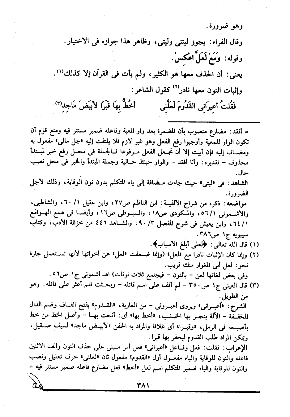 2 وإنما كان الإثبات نادرا مع "لعل" "وإنما ضعفت "لعل" عن أخواتها لأنها تستعمل جارة نحو: لعل أبي المغوار منك قريب.