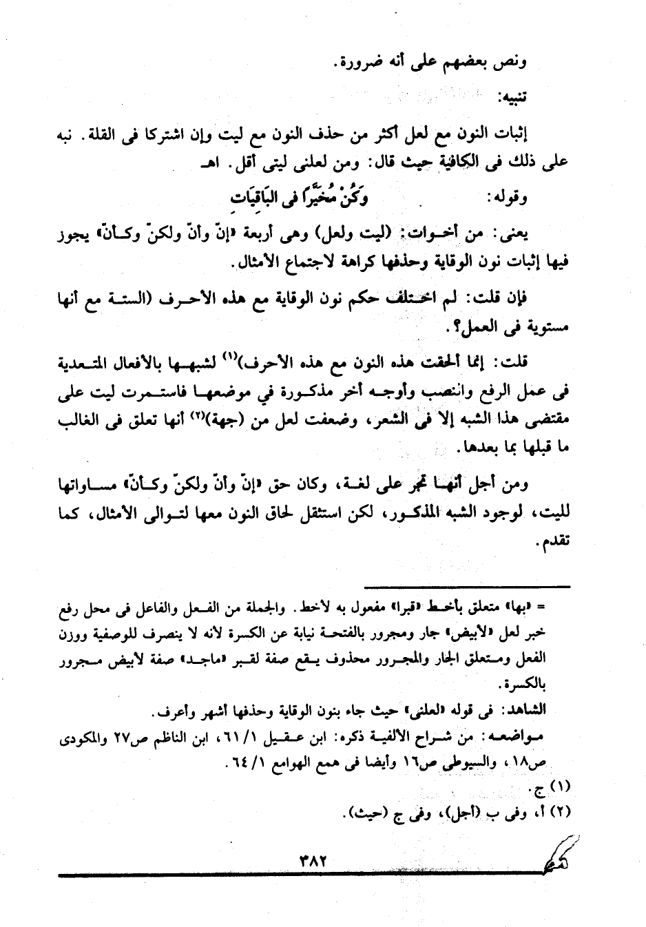 إثبات النون مع لعل أكثر من حذف النون مع ليت وإن اشتركا في القلة. نبه على ذلك في الكافية حيث قال: ومن لعلني ليتي أقل. ا. هـ.