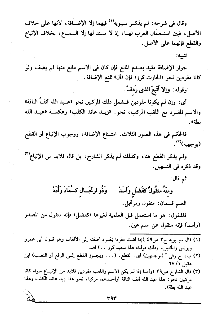 3 قال الشارح ص29: "وأما إذا لم يكن الاسم واللقب مفردين فلا بد من الإتباع سواء كانا مركبين نحو: هذا عبد الله أنف الناقة أو أحدهما مركبا، نحو هذا زيد عائد الكلب وهذا عبد الله بطة".