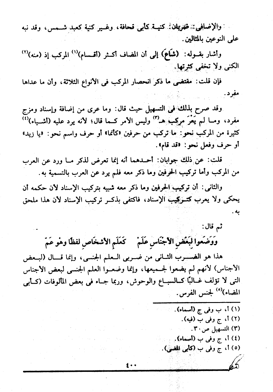 وقد صرح بذلك في التسهيل حيث قال: وما عري من إضافة وإسناد ومزج مفرد، وما لم يعرَ مركب. ا. هـ3. وليس الأمر كما قال؛ لأنه يرد عليه "أشياء"4 كثيرة من المركب نحو: ما تركب من حرفين "كأنما" أو حرف واسم نحو: "يا زيد" أو حرف وفعل نحو: "قد قام".